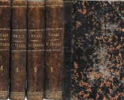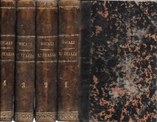 in 12°, 1° vol.: pp. 4 nn., 186, 4 nn., 181, 2 b.; vol. 2° pp.: 166, 2 b., 174, 2 b.; vol. 3° pp.: 175, 150, 2 b.; 4° vol. pp.: 150, 2 b., 72, LXIII (DISCORSO del Sig. Antonio BENCI tolto dall'antologia di Firenze, fasc. XIV, febbraio 1822); m/pelle coeva con tit. e fregi in oro al ds., belle inc. all'antip. e al front. Non comune ed interessante storia delle popolazioni italiche antiche a cui l'A. fu il primo a riconoscerne il ruolo e l'importanza per la formazione della civiltà italica. Lievi e rare fior., ex libris inciso a secco.