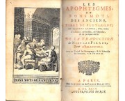 in 12°, pp. 1 b., 2, 1 b., 16 nn., 473, 31 nn.; p/pelle coeva, ds. a nervi con tit. e fregi in oro, tagli spruzz.; grande antip. inciso, front. in rosso e nero e numerosi finalini in xilografia. Scrive d'Ablancourt nella prefazione: J'ai pris pour fondement de cet ouvrage ceux de Plutarque et de Diogéne Laerce, comme Henry Estienne nous les a donnez, mais je n'ai pas laissé d'en ajouter une infinité d'autres de ceux qu'Erasme a recueillis, et que Lycosthéne a rédigez par chapitres. Graesse V, p. 369. Lievi abrasioni alla leg. e qc. rara fior., ma esemplare fresco.