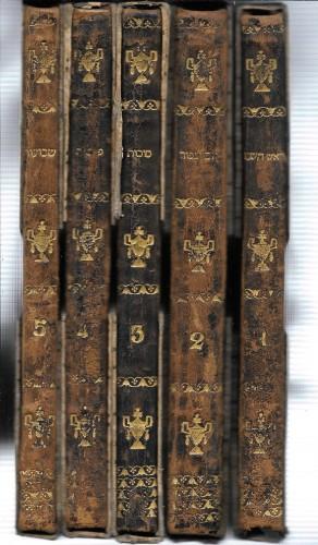 in 16°, pp. numerate solo al recto 149; 217; 131; 142; 97; leg. coeva p/pelle marezzata con fregi in oro ai ds., custodie rilegate per ogni vol., fregi ai front.; testo ebraico in caratteri di varie dimensioni; lievi arrossamenti dovuti al tipo di carta, qc. piccola sbucc. alle leg. e alle custodie, ma voll. ben conservati.