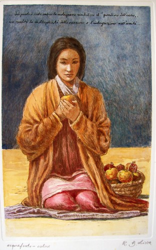 E’ ormai quasi mezzo secolo, d’altronde, che vivo con la mia “Bella Principessa Pittura” come diceva Francisco de Hollanda. Direi, piuttosto, che questa mia mostra rappresenta un nuovo importante capitolo della mia storia artistica. Un punto di arrivo e di partenza, come un velista solitario che approda alla sua meta e, subito dopo, riparte sfidando il mare ed il vento verso nuove avventure. Per fare un esempio, in tutte le mie mostre ho sempre esposto delle opere in parte ispirate all’Oriente. Ma questa volta rappresento la cultura orientale nel contesto di una visione spirituale sistematica, quale il simbolismo tradizionale. Quanto alle acqueforti, il mio “cavallo di battaglia” come si dice nel gergo dell’arte, oggi propongo una nuova ricerca : l’acquaforte come “pezzo unico”, dipinta a colori, con intensità e trasparenze diverse. Ho dipinto con l'acquerello, o con la tempera, o con complesse tecniche miste le stesse mie incisioni, create inizialmente con il loro segno monocromo, dagli abituali toni di terra gialla, di ocra, di caffè e di legno stagionato. Ora ti mostro un esempio di questa tecnica. Guarda attentamente questi miei "Hommages” dedicati a Guénon, a Baudelaire, a Cervantes, a Leonardo e a Raffaello. E prendi tra le mani questa acquaforte dipinta del piccolo monaco buddista, che è stata anche riprodotta sulla locandina della mostra. O questa bellissima Salomè, che - come dice l'iscrizione riportata a margine - spiega “ …avendo danzato, piacque ad Erode ed ai suoi commensali (Marco 6 – 22). Oppure, questo austero saggio senegalese che, come dice l'iscrizione ammonisce “…Però voi scegliete la vita terrena, mentre quella futura è l'ottima, l'eterna!”, citando un versetto del Corano. Scoprirai che queste opere sono le stesse mie acqueforti in monocromia, dipinte però con la mia nuova tecnica che le rende un pezzo unico. Ti piacciono ?
