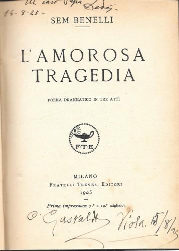 prima ediz., in 16°, pp. 200, leg. coeva p/tela fantasia con tit. in oro su tass. al ds., tagli spruzz.; dramma medievale ambientato a Pistoia; firme ...