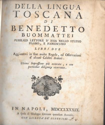 in 8°, pp. XVI, 288, bross. muta coeva con tit. manos. al ds., firma cancellata al front. Regole grammaticali e sintattiche della lingua toscana; ...