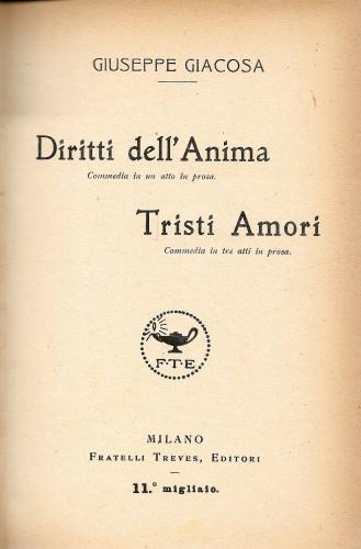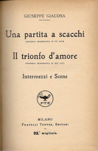 in 16°, pp. 4 nn., 219; leg. coeva m/pelle, ds. a nervi con tit. e fregi in oro. Collana: Teatro in versi di Giuseppe Giacosa; lievi fior. 465/31