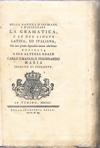 in 8°, pp. 8 nn., 159, cartone rustico coevo; stemma reale inc. al front., capil. e test Opera dedicata a Sua Altezza Reale Carlo Emanuele Ferdinando ...