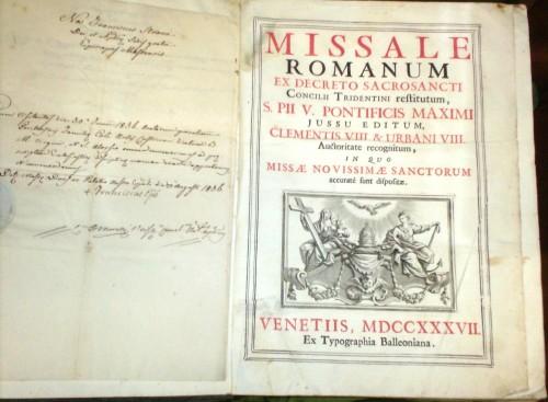 in 4° (cm 33x23,5), pp. 2 b., XXXVI, 460, XCVI, 36 nn. di messe e festività varie; alle ultime 2 cc. vi sono applicati una Concessione di Papa Cleme ...