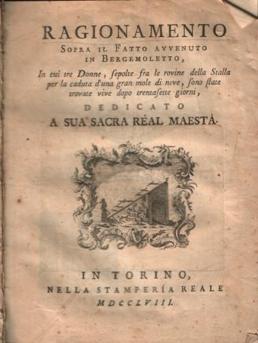 in 4° antico (cm 22,5x16), pp. 8 nn.,165, 1, 2 b., 2 tavv. ripiegate; leg. ottocentesca in m/tela blu con tit. in oro al ds., piatti in carta marmor., al front. vignetta che raffigura sinteticamente l'evento narrato nel libro; alcune testatine e grandi capil.; lievi fior.