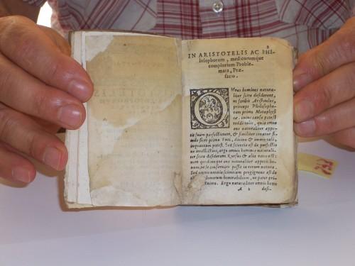 in 12°, pp. 176, leg. in p/perg. molle coeva con tit. manoscr. al ds., tit. al front. in riquadro animato inc. in xilogr., capil. xilogr. ornati, restauro alle prime 4 cc. per mancanze con perdita di qualche parola a 2 cc., alone di umidità che insiste sulla metà inferiore di tutte le pp. L'A., filosofo e medico salentino (Galatina 1460 – Padova 1532) fu un grande commentatore di Aristotele e Averroé, e fu insigne e stimato professore presso l'Università di Padova. La sua predilezione per l'Averroismo gli procurò non pochi problemi con la censura ecclesiastica.