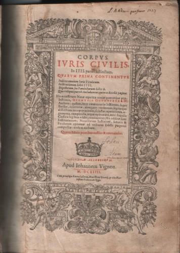 in 4°, pp. 48 nn., 2018 colonne, 4 b.; p/pelle coeva, ds. a nervi con tit. e fregi in oro su tass., tagli rossi; front. in rosso e nero entro bella cornice architettonica in xilografia. Il front. è applicato ad una sguardia. Il Corpus iuris civilis è la raccolta di tutte le regole del diritto romano che l'imperatore Giustiniano fece redigere e riordinare dopo il 530 per rendere praticabile il sistema giuridico ormai caotico. E' alla base del diritto dei paesi occidentali e venne chiamato così per la prima volta nell'edizione di Dioniso Gotofredo (1615-1681)? nel 1583. Il Digesta è una raccolta di parti di opere giuridiche dei più importanti giuristi classici di Roma fatte adattare da Giustiniano al diritto vigente al suo tempo (interpolazioni giustinianee) e ordinate per titoli. Mancano 16 pp. tra quelle non numerate che precedono il testo, piccole mancanze e sbucciature alla leg., firme di poss.