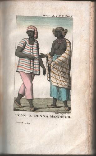 prima ediz. ital, in 8° piccolo (cm 16,5x10), pp. x, 287, 315; leg. coeva m/pelle con angoli con tit. in oro su tass. al ds. e fregi, tagli spruzz.; collana "Raccolta de' viaggi più interessanti... dopo quelli del celebre Cook e non pubblicati fin ora in lingua italiana", tradotto da Vincenzo Ferrario, con 9 acqueforti di Dall'Acqua acquerellate da Lazaretti e protette da veline, che illustrano usanze, costumi, piante e scene di vita. Lievi e rare fior., qc. mancanza al ds.