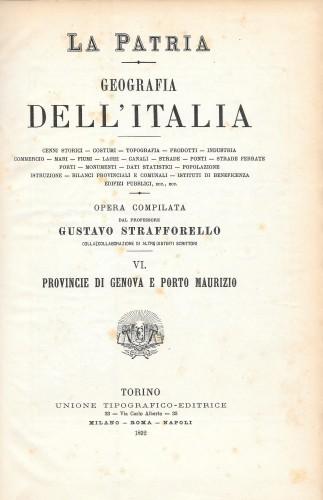 in 8° grande, pp. 383, p/tela coeva viola con tit. in oro al ds.Collana: La Patria - Geografia dell'Italia. Cenni storici, geografia, usi e costumi, prodotti, industria, commercio, popolazione etc. dei Circondari di: Genova, Albenga, Chiavari, Savona; La Spezia, Porto Maurizio e San Remo; con 1 c. geogr. a colori ripiegata della Liguria, 2 piante a colori del porto e della città di Genova, e Veduta generale dell'Arsenale della Spezia anch'esse ripiegate, e 113 ill. b/n n.t.; lievi fior. e piccole abrasioni alla leg.