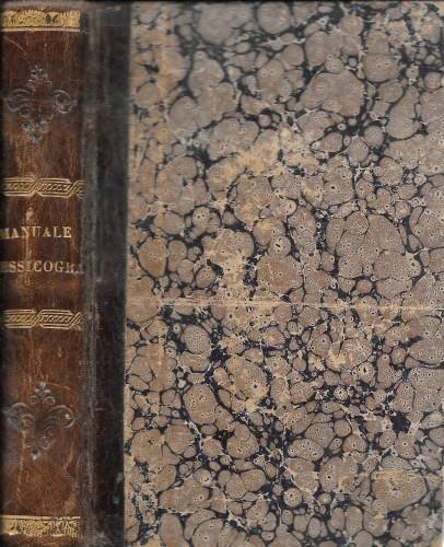 in 16°, pp. 469, leg. coeva m/pelle con tit. e fregi in oro al ds., piatti marmor., testo su due colonne; "...contenenti le voci riguardanti gli utensili domestici, gli strumenti delle arti, ec. - quelli di vario significato - gli appartenenti alla vittuaria - dei vestimenti - degli edifici e adjacenze - del regno animale - le esprimenti le qualità degli oggetti aggiuntivi... Compilato per cura di un piacentino ad uso dei giovanetti"; fior. diffuse.