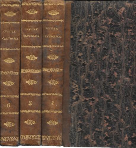 in 8°, pp. 720, 720, 720; leg. coeva m/pelle con tit. e fregi in oro al ds., tagli spruzz.; rivista quindicinale che tratta argomenti di storia, politica, filosofia, religione, costume etc.; bella carta bianca con rare fior., piccole sbucc. alle leg., manca l'ultima sguardia.