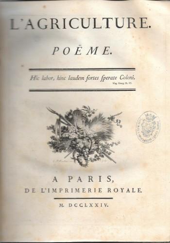 elegante edizione originale, in 4° pp. 14 nn., lvj, 278, 2 b.; 2, xvj, 128; leg. coeva p/pelle marmorizzata, tit. in oro su tass. al ds. con 5 nervi e fregi in oro alle finestre, fregi in oro all'unghia e sguardie marmor., tagli spruz., nastro segnalibro. Poema didattico sull'agricoltura e l'allevamento che cerca di trasmettere, in rima, nozioni utili alla vita in campagna. Le tecniche e gli stili dei numerosi artisti che hanno partecipato all'illustrazione di quest'opera, ne fanno quasi un'antologia dell'illustrazione francese del '700, pur risultando armonizzati tra loro. I 2 front. hanno vignette di Marillier e citazioni da Virgilio; le 8 bellissime inc. f.t. a p/pag. e le 7 grandi testatine sono di De Ghendt, le Gouaz, Ponce, Le Veau, Lingee su disegni di St. Quantin e di Loutherbourg; vi sono inoltre fregi e finalini. L'opera è composta da: Au Roi (dedica), Discours sur la poesie géorgique, un saggio sulla poesia bucolica nella letteratura francese con osservazioni su Virgilio ed Esiodo; L'Agriculture poème (in 6 canti), nella 1^ parte; da una Préface, con riferimanti ad una lettera di Voltaire a Rosset; nella 2^ parte: L'Agriculture poème (in 3 canti), Observations, con interessanti osservazioni di biologia, astronomia, botanica, tecniche agricole etc. Carta forte con ampi margini, rare e lievi fior., leg. appena un po' allentata e lievi danni alle cuffie ma buon esemplare; ediz. anteriore a quella citata dal Graesse VI, p. 168; Brunet IV, 1404. Raro.