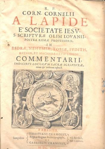 in folio (cm 33,8x22,5), pp. 2 b., 8 nn., 346, 17 nn. di indici, 3 b.; legatura ottocentesca in m/pelle con tit. e fregi in oro al ds., piatti marmor., tagli gialli; front. in rosso e nero con grande vignetta allegorica con motto, m. grandi testatine e capil. Apprezzata esegesi del famoso biblista belga, insegnante di ebraico e sacra scrittura a Lovanio e a Roma. Lievi arrossature non uniformi dovute al tipo di carta, qc. lieve alone marginale, sguardie anticamente rifatte e sbucc. ai piatti.