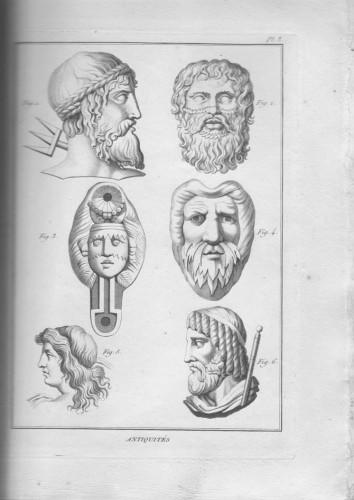 in 4°, pp. 2 b., 2 nn., viij, 40 di testo, 97 tavv. f.t.; leg. coeva m/tela verde con piatti marmor., tit. in oro su tass. al ds. L'A., specialista in antichità classica, epigrafia, iconografia, storia dei costumi e numismatica, intraprende nel 1786 la pubblicazione di quest'opera (in 2 volumi con 380 tavv.), che fa parte dell'Encyclopédie méthodique di Panckoucke, opera monumentale in 210 volumi pubblicati nel corso di 50 anni. Il presente volume contiene: Observations generales sur ce recueil d'antiquites; Ordre des tetes mythologiques; Table de la seconde partie; Chap. 1° - Tetes mythologiques; Chap. 2° - Armes offensives; Chap. 3° - Cavaliers et chevaux de guerre; Chap. 4° - Enseignes militaires; seguono le 97 tavv. f.t. disegnate da Madame Mongez ed incise sotto la direzione di Bouillard, con visi, acconciature, elmi, corazze, armi da taglio, scudi, punte di frecce, calzari, cavalli e insegne. Lievi ombreggiature ma opera su carta forte con ampi margini ed in barbe.