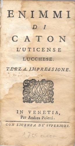 in 12° (cm 14,2x7,5), pp. 144, 8 nn. di Chiave delli Enimmi; cartonato coevo rustico; 144 enigmi in rima, con soluzioni alle pp. finali nn., apparsi per la prima volta nel 1689. Melzi I, 188; OPAC SBN IT\ICCU\RAVE\041401. Lievi aloni e fior. diffuse.