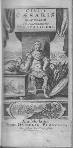 in 12° (cm 12,2x6,2), pp. 456, 54 di indici; legatura ottocentesca in m/pelle con tit. e fregi in oro al ds., piatti marmor., frontespizio in rame con Cesare che detta le memorie a scriba, arni e scudi a destra, vignetta in ovale sotto. Il carattere elzeviro, nitidissimo e di grande finezza, è ispirato al romano antico ma con l'occhio molto più piccolo; con 3 cartine ripiegate della Spagna, della Gallia e dell'Impero romano dall'Inghilterra al Marocco all'Arabia Felix, indice dei luoghi e delle cose notevoli; lievi fior. e lievi sfregamenti alla leg.
