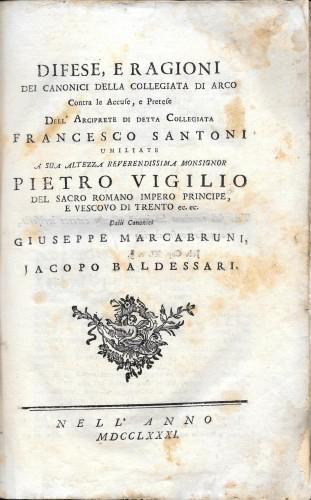 in folio, pp. XXXVIII, 2 b., pp. 52, 96, xxxj; bella leg. recente m/perg., ds. a nervi con tit. manos., piatti marmor., vignette ai front., mm. fregi tip. in rame e in xilografia, come testatine, grandi capil. e finalini, 3 grandi inc. alle armi vescovili. Titoli dei capitoli: Esposizione del fatto, e dello stato della quistione + Documenti; Scrittura I. delli canonici G. Marcabruni e J. Baldessari, ossia Giustificazione della loro riserva fatta nel Capitolo dei 23 giugno 1780; Scrittura II. delli canonici G. M. e J. B. che contiene la deduzione delle ragioni nel merito contra le così dette transazioni degli 8 gennajo, e 9 febbrajo 1780; Scrittura III. delli canonici G. M. e J. B. ossia Replica contra la risposta del signor Arciprete della Collegiata di Arco; Codicillo di documenti spettanti alla Chiesa Collegiata d'Arco raccolti nel breve tempo di un mese da G. M. e J. B.; bella leg. recente m/perg., ds. a nervi con tit. manos., piatti marmor., vignette ai front., mm. fregi tip. in rame e in xilografia, come testatine, grandi capil. e finalini, 3 grandi inc. alle armi vescovili; alcune bruniture e lievi aloni, rinforzi alla prima ed ultima c.