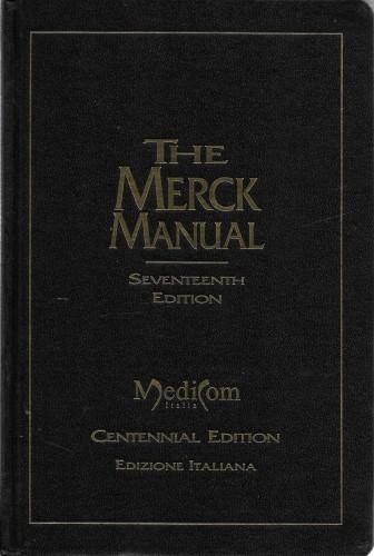 in 8°, pp. XLII, 3030, leg. edit. similpelle nera con tit. in oro, rubricatura a intaglio. Traduz. della 17^ ediz. del Merck Manual of Diagnosis and Theraphy nel centenario della sua pubblicazione. In ottimo stato.