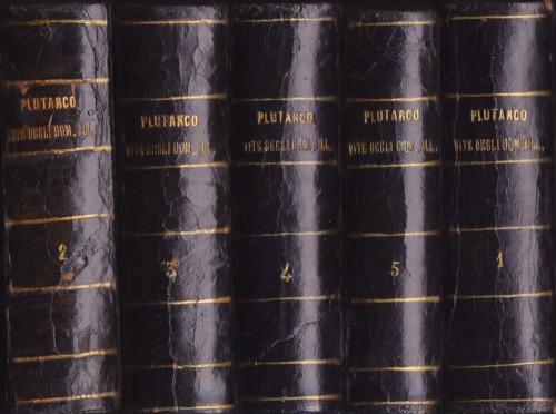 in 24°, pp. 1° vol.: 192, 2 b., 189, 5 b., 228; 2° vol.: 174, 4 b., 210, 4 b., 210; 3° vol. 237, 3 b., 192, 179, 1 b.; 4° vol.: 200, 211, 1 b., 173, 3 b.; 5° vol.: 183, 3 b., 179, 1 b., 2 nn., 147; leg. coeva m/pelle nera, tit. e filetti in oro ai ds. Opera tradotta da Girolamo Pompei che ha eseguito anche la bella prefazione, corredata con note scelte tra quelle di Dacier, e note storiche su Plutarco del Signor Villemain; lievi e diff. fior. dovute al tipo di carta e piccoli restauri ben eseguiti al ds.