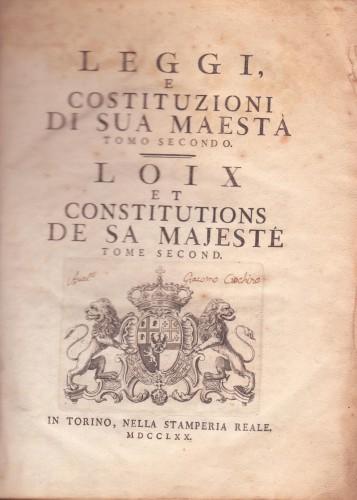 in 4°, pp. 574, 2 b., leg. coeva p/pelle, ds. a nervi con tit. in nero, tagli rossi, grande vignetta al front. con le armi sabaude, testo su 2 colonne italiano-francese. Leggi e costituzioni emanate da Carlo Emanuele III, monarca illuminato che uniformò la legislazione del regno, importante fonte di notizie su usi e costumi dell'epoca, diritti e doveri di minoranze religiose, diritti di successione, istruzione dei processi criminali e molto altro. Mancano il capitello e la cuffia sup., lievi abrasioni alla leg., rari aloni e fior.