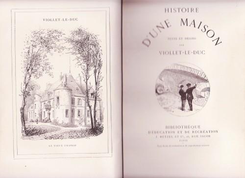 in 8°, pp. 4, 260; leg. coeva m/marocchino rosso, ds. a nervi con tit. e fregi in oro, stemma di Parigi in oro al piatto, tagli dorati, sguardie moiré; con 62 disegni dell'A. n.t. e f.t., di cui 4 cromolitografie, che ill. le varie fasi di costruzione della casa. Esemplare fresco.