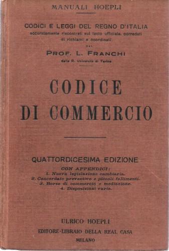 in 16°, pp. 334, leg. edit. con tit. in nero. 'Codici e Leggi del Regno d'Italia' 14^ ediz. 'Con appendici: 1 - Nuova legislazione cambiaria; 2 - Concordato preventivo e piccoli fallimenti; 3 - Borse di commercio e mediazione; 4 - Disposizioni varie'. Ottimo.