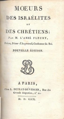In 12°, pp. viij, 408 ; p/pelle coeva, ds. con tit. e fregi in oro, tagli rossi, richiami marg. Ampio compendio sulle credenze, riti, superstizioni, usi e costumi, feste, matrimoni, funerali, divertimenti, arti e mestieri, educazione dei figli, vita politica, amministraz. della giustizia, guerre, territorio etc. tratte dai testi sacri e dagli scritti antichi delle due religioni da parte dell'A. della monumentale "Histoire ecclésiastique" in 20 volumi; piccolo foro al marg. inf. di alcune pp. senza perdita di testo e qc. fior.