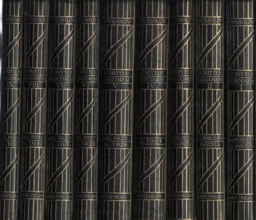 in 8°, pp. 384; 362; 302; 300; 485; 455; 346; 294; 236; leg. edit. p/tela nera e blu con tit. e fregi in oro al ds.; ritratto di Mussolini protetto da velina, diverso per ogni vol.; bella carta 'Sparta' delle Cartiere di Maslianico, filigranata con Fascio Littorio. Opera curata dal dott. Valentino Piccoli, redattore del Popolo d'Italia, ben conservata ed intonsa.