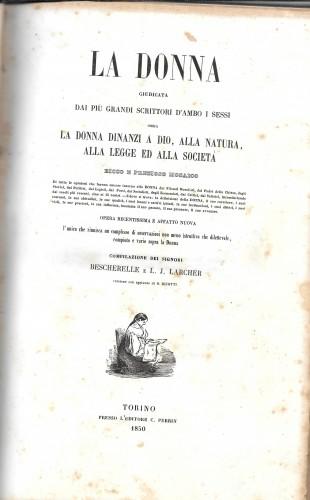 in 8° grande, pp. VII, 711, leg. edit. m/tela verde con ill. applicata ai piatti, vignetta al front., testo incorniciato da cornici varie. Traduz. con aggiunte di O. Ricotti. Dal significato della parola 'donna' presso tutti i popoli e in tutte le lingue, alla sua creazione e costituzione fisica, dall'Antico testamento alla donna nelle definizioni degli scrittori e pensatori moderni, pudore, castità, bellezza naturale e fittizia, matrimonio, prostituzione, dei nomi delle donne presso i vari popoli, definizioni burlesche, insomma tutto ciò che ha a che fare col femminile. Lievi fior. sparse e ds. rifatto, ma opera interessante e non comune.