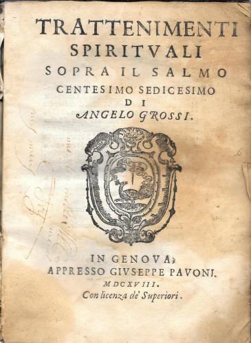 in 4° antico (cm 20x15), pp. 680, 44 nn. di indici; leg. coeva p/perg., ds. a nervi con tit. manos., grande marca tip. col pavone, simbolo dell'editore (nel senso moderno del termine) genovese , al front. ed altra diversa in fine, grandi capil. abitati ed altri fregi tip. 24 Trattenimenti. Lievi fior. e lieve alone all'angolo inf. interno di m. pp., pergamena un po' cotta dal tempo ma solida. Raro.