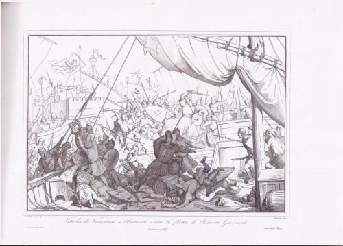 Album oblungo (cm. 32x45) rilegato in m/pelle verde con ds. a nervi e tit. in oro contenente: pp. 4 di carta rosa, 26 pp. di front. (Venezia assisa con lo scettro in mano e il leone al suo fianco e stemma araldico ai suoi piedi), 'Indice' con titoli e brevi spiegazioni delle tavv., 'Prospetto della storia veneta' di Francesco Zanotto, e 'Ultimi istanti della Repubblica'. Seguono le 150 tavv. incise da Antonio Viviani, Zuliani, Zanetti, Bordignon, Conte, Bultazzon, Bernasconi, Reinhart ed altri; 4 pp. di carta rosa chiudono il vol. Storia della Serenissima dall'anno 452 al 1797 espressa in 150 tavv. che ne illustrano i fatti salienti. L'opera era uscita a fascicoli. Sbucc. e ammaccature alla leg., lievi aloni e fior. ai margini di parecchie tavv., mancanze al margine di 2 tavv., strappi riparati ad alcune tavv. Nel complesso buon esemplare.