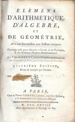 n 8°, pp. xij, 524; p/cuoio coevo, ds. a nervi con tit. in oro su tass., sguardie marmor., tagli rossi. Ouvrage utile pour faire entrer dans l'esprit de ces Sciences et pour disposer à l'étude de la Physique et des Sciences physico - Mathématiques; opera ill. da 16 tavv. incise in rame ripiegate in fine, con figure geometriche e disegni; conservati alcuni ff. con dimostrazioni di teoremi inseriti da antica mano; lievi abrasioni alla leg. e rare fior. ma buon esemplare.