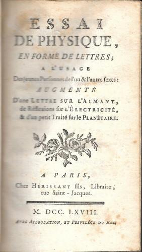 in 12° (cm 16x9,5), pp. 2 b., xij, 584, 4 nn., 2 b.; leg. coeva p/pelle marmor, ds. a nervi con tit. e fregi in oro, tagli e sguardie marmor. L'A., allievo di Delor e dell'abate Nollet, ha scelto le esperienze più curiose e le più recenti scoperte scientifiche dell'epoca per trasmettere i principi della fisica sperimentale, argomento di grande interessa tra la gente colta del suo tempo; l'ultima parte è dedicata all'astrologia e all'astronomia; piccolo restauro ben eseguito al ds., lievi ombreggiature alle prime cc., ma ottimo e fresco esemplare.