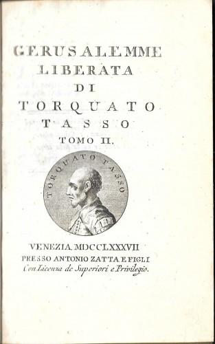 in 8° (cm 14,7x9), pp. 6 nn., 328, 6, 336, leg. coeva p/pergamena, tit. in oro su tass. e fregi ai ds., tagli gialli, nastri segnalibri, medaglioni ai front. coi ritratti del Tasso. Opera ornata da 20 fini incisioni in rame, con citazione, poste all'inizio di ogni canto. Esemplare ad ampi margini, fresco, con rare fior.