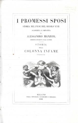 in 4°, pp. 864, leg. coeva m/pelle con tit. e fregi in oro al ds., conserva l'originale bross. azzurra ill., grande antiporta allegorico e vignetta al front., testo incorniciato da doppio filetto, con ampi margini ed ill. da 450 vignette n.t., per la maggior parte di F. Gonin, ma anche di P. e L. Riccardi, Boulanger, M. D'Azeglio, L. Bisi, G. Sogni etc., inc. in legno da Bernard, Poller, Loiseau, Sheeres e L. Sacchi. Prima ediz. definitiva de "I promessi sposi" e prima ediz. originale della "Storia della colonna infame". Esemplare fresco, rare e lievi fior., solo piccolo restauro ben eseguito al ds.; ex libris alla sguardia, timbro blu al front e 2 timbri a secco. Raro.
