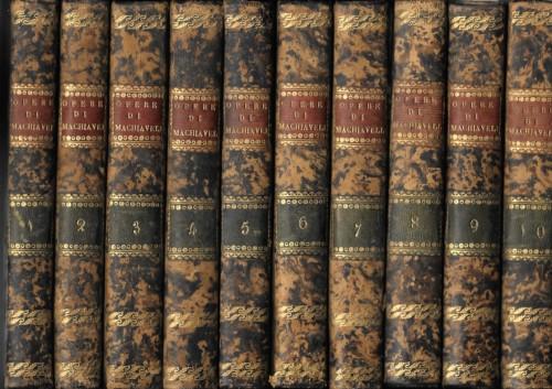 in 8°, pp. 6 nn., CL, 2, 137, 4; 321, 3; 396 (manca 1 pag. dell'Indice; 380; 358, 2; 354, 1; 372, 2; 381, 1; 382, 1; 374. Legatura coeva in p/pelle marezzata con tit. in oro su doppi tasselli ai ds., tagli spruzz. rossi. Con 2 tavv. ripiegate: Figura dell'Alloggiamento nel 5° vol., e un Saggio della forma del carattere di N.M. all'antip. del 10° vol.; manca il ritratto, lievi fior. e qc. lieve abrasione alle leg. ma buon esemplare.
