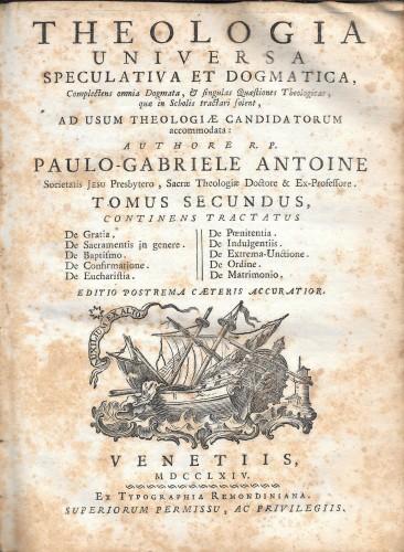 in 4°, pp. VIII, 372, p/perg. coeva con tit. manos. al ds., tagli pennellati, vignetta con imbarcazione e motto incisa al front.; gli argomenti di questo 2° vol. sono la Grazia e i Sacramenti; diffuse fior. e piccola mancanza al piatto ant.