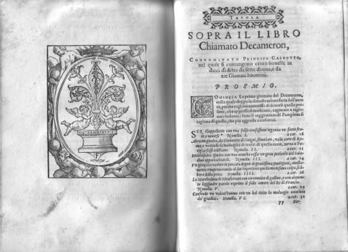 in 4° (cm 22x15), pp. 32 nn. (di dediche, permessi, introd. del Salviati, Proemio), 585, 79 nn. (Tavola sopra il Libro chiamato Decameron...); solida leg. settecentesca in p/perg. con tit. in oro su tass. al ds., tagli spruzz.; 3 imprese tip. dei Giunti, la 1^ entro ovale architettonico al front., la 2^ molto più grande, allegorica e con motto, posta al verso della c.b. che segue il Registro, la 3^ ancora diversa e con motto, posta al v. della c.b. che segue il Registro dell'Indice a fine vol. Questa seconda ediz., pubblicata nel novembre dello stesso anno della prima, "deve riguardarsi come l'ottima fra quelle del Salviati" secondo il Gamba (181, p. 58-59), essendo particolarmente accurata, sia per l'integrità del testo che per la competenza delle note del Salviati (Firenze 1540 - 1589), umanista e filologo italiano di nobile famiglia, tra i principali promotori della fondazione dell'Accademia della Crusca nel 1582 e venerato come l'oracolo di Firenze, della Toscana e dell'Italia (cav. Baldelli). Molto bella anche dal punto di vista tipografico sia per l'eleganza e la nitidezza del carattere corsivo che per la finezza dei grandi capil. xilografici abitati (cm 4x4) che ornano l'inizio di ogni novella. Lievi ombreggiature ai margini e qc. lieve alone dovuti all'uso, piccole mancanze riparate al margine delle prime 6 cc. che non interessano il testo, ma solido ottimo vol. Raro.