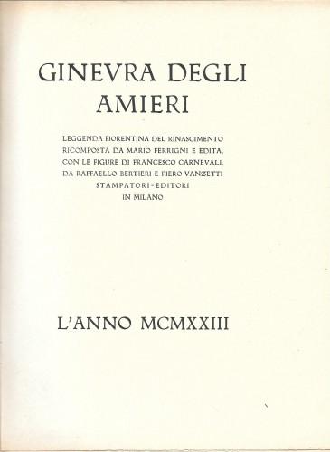 in 8°, pp. 247, leg. edit. con angoli. Leggenda fiorentina del rinascimento ricomposta da Mario Ferrigni ed edita, con le figure di Francesco Carnevali, da Raffaello Bertieri e Piero Vanzetti stampatori - editori in Milano. Ill. in b/n e bicromia, tit. e capil. in rosso; copia n° 336 di 2100, in ottimo stato.