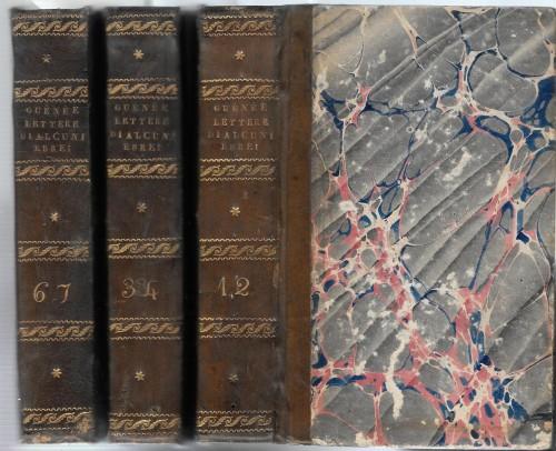 in 16°, vol. 1° tomi 1° e 2° pp. 14, XXIV, 4, 348, 4; vol. 2° tomi 3° e 4° pp. 406; vol. 3° tomi 6° e 7° pp. 252, 178, 2; leg. coeva m/pelle con tit. e fregi in oro al ds., piatti marmor., tagli gialli. "Con un breve commentario estratto da uno più ampio ad uso di quelli che leggono le di lui opere... Prima versione italiana sopra l'edizione decima di Lione". Garbata ma puntuale confutazione degli attacchi di Voltaire contro la Bibbia in forma pseudoepistolare. Manca il tomo 5, lievi fior.
