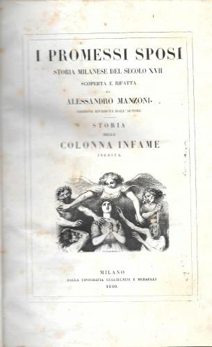 in 4°, pp. 864, leg. coeva m/pelle con tit. e fregi in oro al ds., (manca l'originale bross. azzurra), grande antiporta allegorico e vignetta al front., testo incorniciato da doppio filetto, con ampi margini ed ill. da 450 vignette n.t., per la maggior parte di F. Gonin, ma anche di P. e L. Riccardi, Boulanger, M. D'Azeglio, L. Bisi, G. Sogni etc., inc. in legno da Bernard, Poller, Loiseau, Sheeres e L. Sacchi. Prima ediz. definitiva de "I promessi sposi" e prima ediz. originale della "Storia della colonna infame". Lievi ma diffuse fior., mancanza riparata alla sguardia ant. e lievi screpolature alla leg., comunque discreto esemplare.