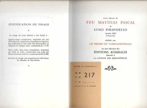 in 8° pp. 281, leg. edit. bianca con disegno originale di Picasso, esemplare n° 217 di 2500 impressi su velina di Lana con una serie di ill. a colori; l'opera è preceduta da "La petite histoire de l'attribution du Prix Nobel a Luigi Pirandello" del Dr. Kjell Stromberg, e da un breve saggio sulla vita e l'opera dell'A. di M. Apollonio.