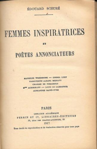 in 16°, pp. X, 367, bella leg. coeva m/pelle, ds. a nervi con tit. in oro, piatti e sguardie in carta marmor.; Mathilde Wesendonck, Cosima Liszt, Marguerite Albana Mignaty, Charles de Pomairols, Mme Ackermann, Louis Le Cardonnel et Alexandre Saint-Yves.