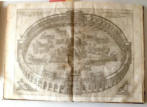 in folio (cm 36,7x26), pp. 2 b., 18 nn., 148, 17 nn., 1 b., 124, 2 b.; leg. coeva m/pelle con angoli, ds. a nervi, piatti marmor., tagli pennellati, grande frontespizio architettonico con 8 riquadri, testatine e capilettera. Con 33 tavv. di cui 24 a doppia pag., 2 ripiegate, 5 a piena pag. (compreso front.) e 2 ritratti di Panvinio e di Argolo, che illustrano giochi, trionfi e circhi a Roma, Pompei e Costantinopoli; alcune tavole sono datate 1580. L'A. frequentò la Scuola degli accoliti della cattedrale di Verona che, all'epoca del vescovo riformatore Gian Matteo Giberti, si distingueva per la disciplina e per l'ampiezza del suo programma educativo sia nelle lettere greche e latine sia nella musica. Nel 1546, a Napoli, proseguì la sua formazione presso lo Studio Generale dell'Ordine agostiniano; nel 1554 ottenne il permesso straordinario di vivere fuori dal convento e di dedicarsi in proprio agli studi storici sulle antichità romane e sulla storia ecclesiastica. Mancano le tavv.: D, una delle 2 tavv. nominate G, la N, una delle due tavv. nominate Pompae circensis, le ultime 5 pp. di Additamento e il capitello sup.; in compenso c'è una tav. a pag. 63 non nominata nell'indice e intitolata: Circi et ludicri circensis antiquom marmoreum frustum...; lievi sbucc. alla leg. e lievi tracce d'uso, ma opera ben conservata.
