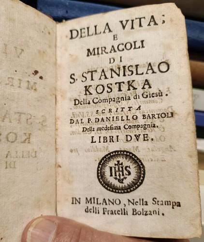 in 12° (cm 12,2x7,5), pp. 12, 424, 10; leg. coeva p/pelle, ds. a nervi con tit. e fregi in oro, tagli rossi, stemma dei Gesuiti al front. ed altro più grande a p. 190, alcuni fregi tip. La data di stampa è desunta dalla pag. del Reimprimatur. Lievi fior. diffuse, lievi abrasioni ai piatti e piccole mancanze al ds.