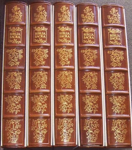 in folio (cm 50x37). Vol. 1 pp. 380, 16 nn., 21 tavole. Vol. 2 pp. 362, 18 nn., 21 tavole. Vol. 3 pp. 346, 22 nn., 19 tavole. Vol. 4 pp. 449, 21 nn., 19 tavole. Vol. 5 pp. 435, 21 nn., 25 tavole. Legatura editoriale in piena pelle di capra color nocciola, dorso a 5 nervi con tit. e decorazioni floreali dorate, sguardie in seta moirée avorio, tagli sup. dorati, gli altri in barbe; custodie rilegate in pelle e seta moirée avorio per ogni vol. Il testo, a cura di Pietro Raggi, Pietro Volonté e Carlo Penna, è in latino stampato con caratteri tipografici che riprendono quelli usati dal Griffio per la celebre Hypnerotomachia Poliphili di Aldo Manuzio del 1499; carta vergata con filigrana della firma di Dali' inserita in un tondo. L'opera è ornata da 105 litografie a colori f.t. a piena pag., su cartoncino e protette da veline in carta giapponese, dai suggestivi acquerelli originali di Salvador Dali. Esemplare n. 510 dei 1499 della tiratura Luxus, bellissima e in ottimo stato, salvo qc. macchiolina ai cofanetti.