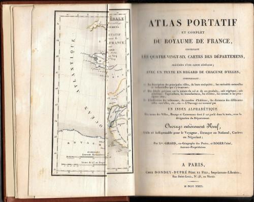 in 8°, pp. VIII, 172 cc. nn., pp. 32 di indice, leg. recente p/pelle, con ds. a nervi, tit. e fregi in oro. Con 87 cartine, alcune ripieg., con i confini colorati e la carta gen. ripieg. degli 86 Dipartimenti del Reame in antiporta. Tutte le inc. sono in rame, f.t. e di alta qualità. Primo importante atlante portatile che riunisce succintamente un materiale informativo di grande utilità per il viaggiatore ottocentesco, indicando, oltre all'antichità e alle curiosità naturali e industriali dei luoghi, anche le attività economiche, il numero di abitanti, le distanze tra le varie località, di oltre 25.000 comuni della Francia di quel tempo. La migliore cartografia precedente non ne segnalava più di 10.000. Testo molto interessante per uno studio dettagliato del Regno di Francia sotto Luigi XVIII, subito dopo il periodo napoleonico. Esemplare in ottimo stato.