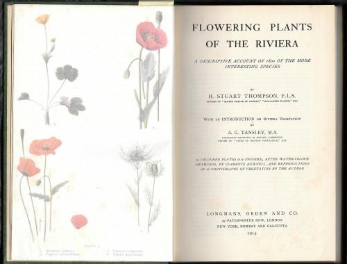 in 8°, pp. xxiii, 2 nn., 249; p/tela verde edit. con tit. in oro e sovracop. in PVC. With an Introduction on Riviera Vegetation by A. G. Tansley; con 112 figure a colori distribuite su 24 tavv. disegnate da Clarence Bicknell. e con 16 riprod. fotogr. b/n dello stesso autore; ben conservato.