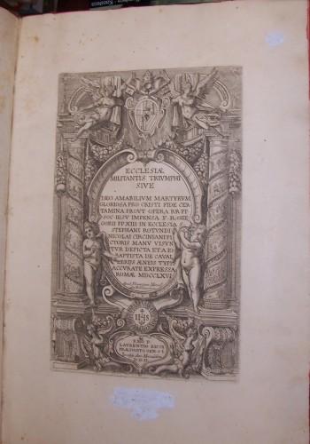 in folio (cm42x28), pp. 2 b., 1 front., 30 tavv., 2 b.; leg. coeva cartonato marmor., ds. a nervi con fregi in oro, tagli rossi. Serie di 31 acqueforti che riproduce un ciclo di affreschi nella chiesa di Santo Stefano Rotondo a Roma, interessante per la rappresentazione del martirio cristiano nel 16° secolo. Firma cancellata al margine inf. del front., alcuni lievi arrossamenti, qc. sbucc. alla leg. reso